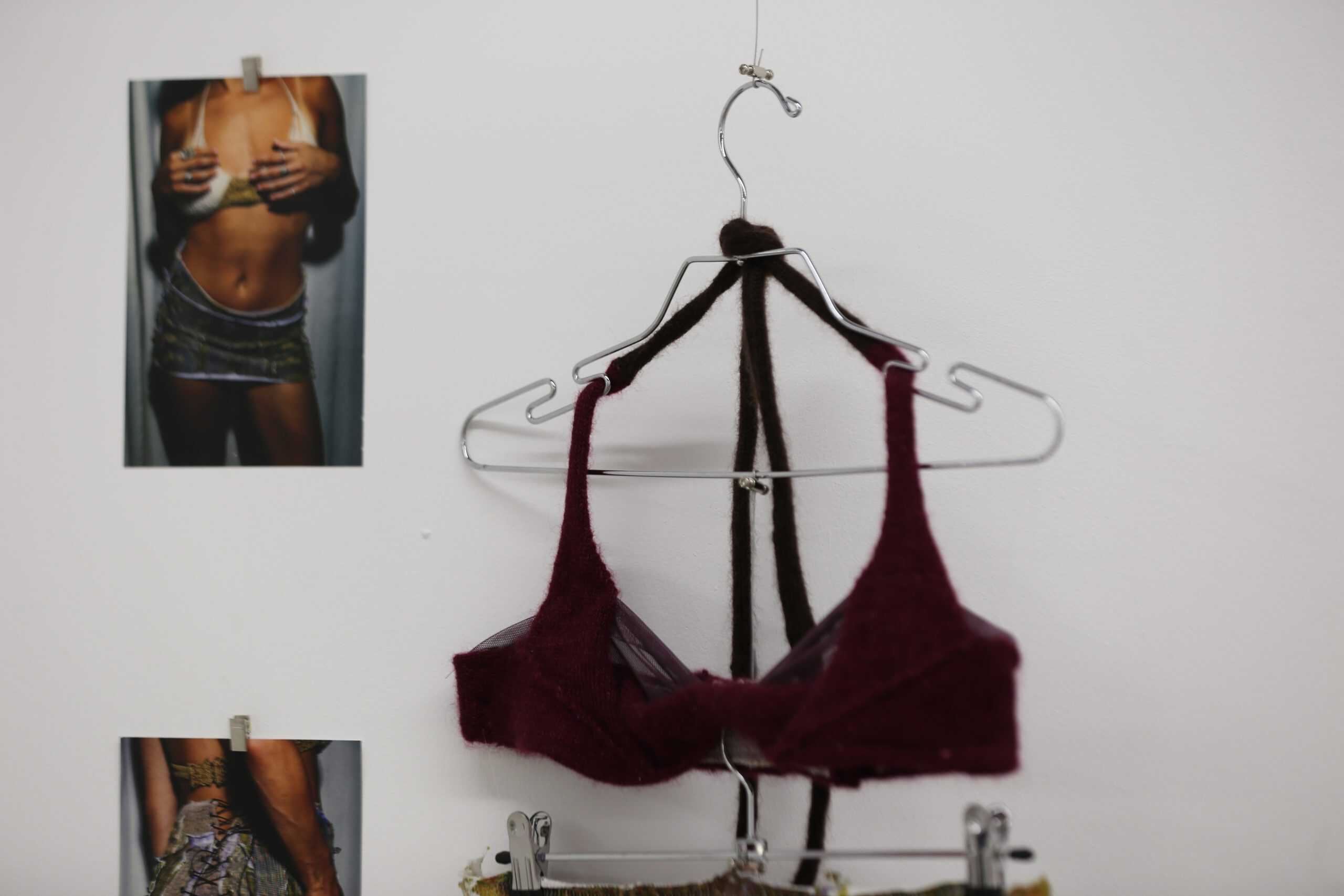 תשובה כזו, מורכבת וחשופה, מגיעה מהאמנית ליהי טיבר. פינת התערוכה שלה מרגישה כמו דף מיומן שנקרע והוצג לראווה. פרויקט הגמר שלה, "חשפו את התקלה שלכם", הוא וידוי גולמי בעידן של שלמות מרוטשת. היא מספרת שהרעיון נולד מתחושה אישית עמוקה: "הכל התחיל מהקונפליקט המוכר הזה שאני עומדת מול הארון ומרגישה ש'אין לי מה ללבוש'. זו יותר חוויה רגשית מאשר פיזית." ה"גליץ'" הדיגיטלי, התקלה בתמונה, הפך עבורה למטאפורה מדויקת לפער בין החיים כפי שהם מוצגים ברשתות לעומת איך שהם נחווים. "אני רואה חברה שמעלה משהו, בזמן שאני יודעת מה באמת קורה לה," היא משתפת בכנות. "זה עולם מאוד מטושטש." באמצעות פריטי הלבשה תחתונה שמונחים על חברותיה באופן נונשלנטי, כזה שלא תמיד מסודר 'כמו שצריך' או פריטים שמוצאים מהקשרם היא מבטאת קול קטן של מרד וקריאה אמיתית לשחרור וחגיגת הנשיות במלואה על פגמיה, יופיה והחיבור של הכוח הנשי, כך היא קוראת לשחרור מ"העריצות של המדיה" כי זה כבר מתיש.