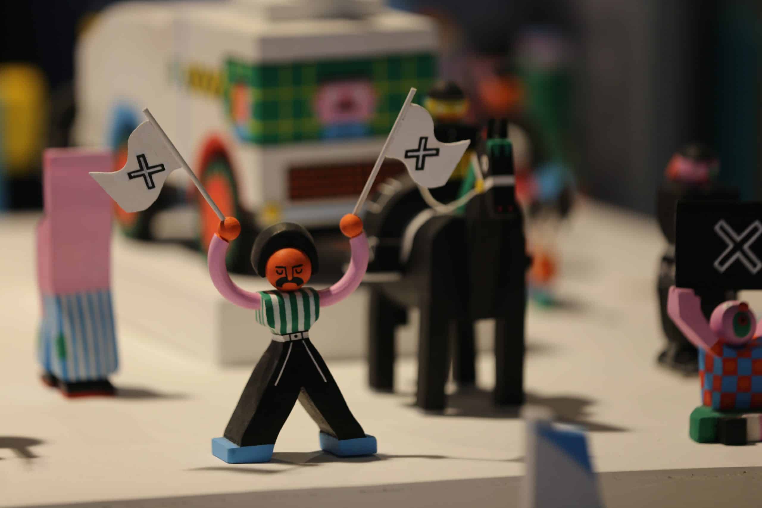 במרחק כמה צעדים משם, מיקה ירושלמי, בפרויקט "צעצועי דמוקרטיה", שואלת אם אנו, המבוגרים, שכחנו כיצד לשחק במושגים שמעצבים את חיינו. דמויות העץ המקסימות שלה מאלצות אותנו להתמודד פיזית עם רעיונות כמו שוויון וזכויות, ולהבין את המורכבות שלהם דרך הידיים, לא רק דרך הראש.