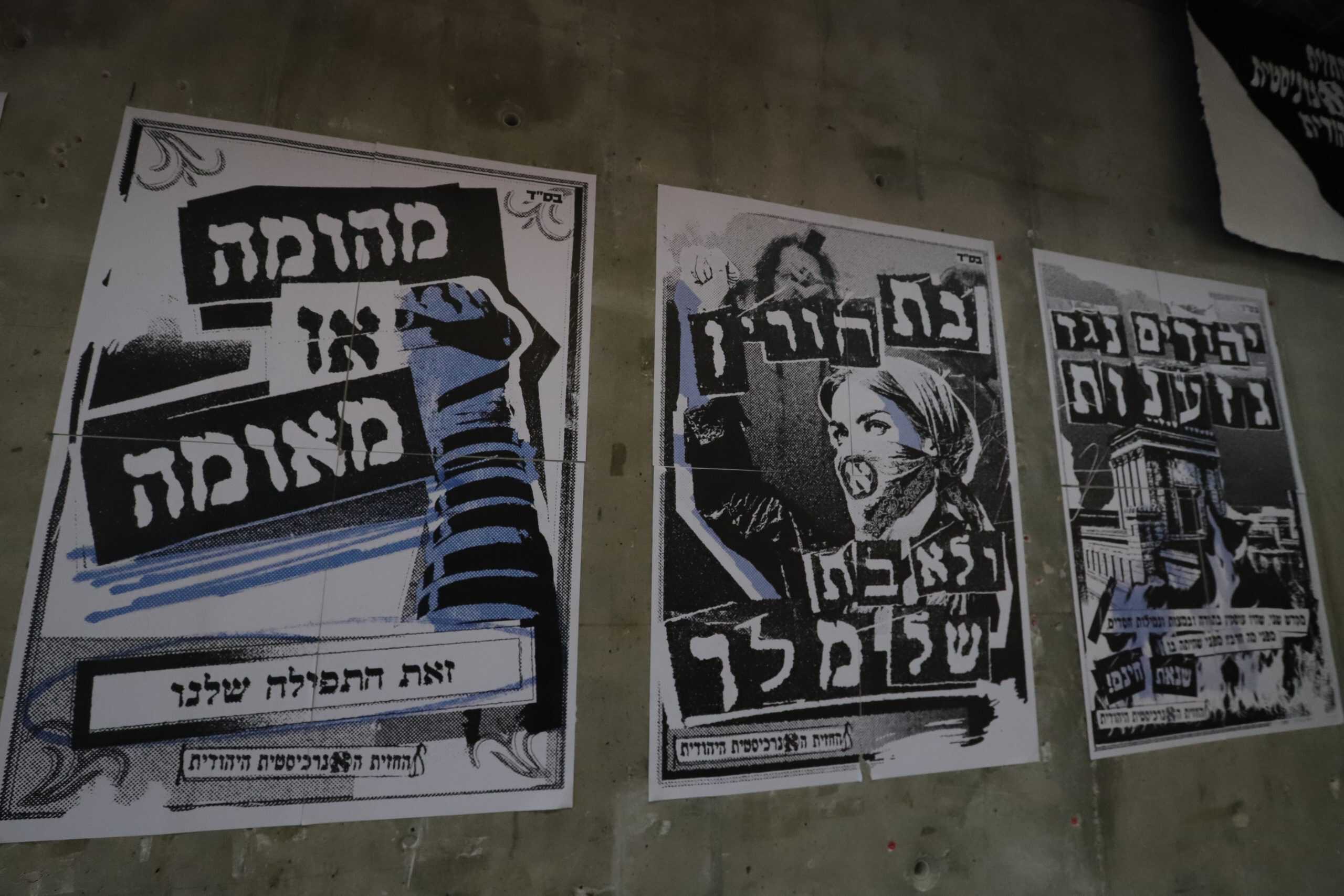 המאבק על זהות וערכים נוכח בעוצמה בתערוכה. אורי מור, בפרויקט "החזית האנרכיסטית היהודית", יוצר תנועה דתית-חתרנית המבקשת לשחרר את היהדות מהממסד. הכרזות, המשלבות טיפוגרפיה של תרבות הפשקווילים יחד עם תרבות הפנזינים וסגנון המחאה האנרכיסטית. כך זועקות סיסמאות כמו "מהומה או מאומה". או "בת חורין ולא בת של מלך".