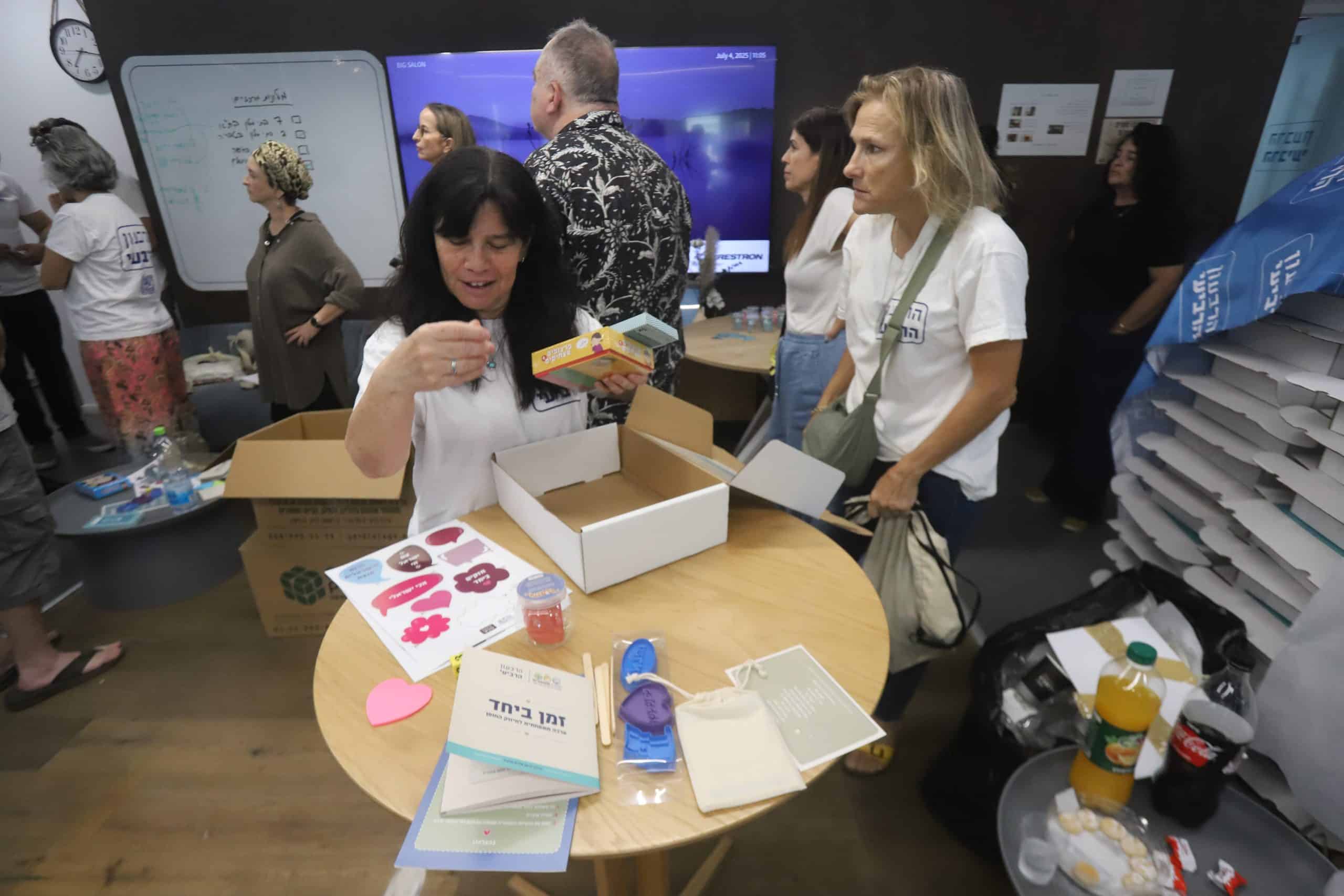 במקום אני פוגש את פלג לוינזון, ראש מערך השטח, ואת שירלי טרקיאלטאוב, פעילה ותיקה. שירלי מראה לי כרטיס קטן מודפס שהיא מוסיפה לכל ערכה, אחד הפלאיירים מעוטר באיור עדין. "אני מכניסה חפיסת קלפים לערכה הזו," היא לוחשת לידי, "אני מדמיינת משפחה שיושבת יחד לשחק, ובורחת מהמחשבות לרגע אחד. אם זה ייתן להם אתנחתא קטנה, עשיתי את שלי."