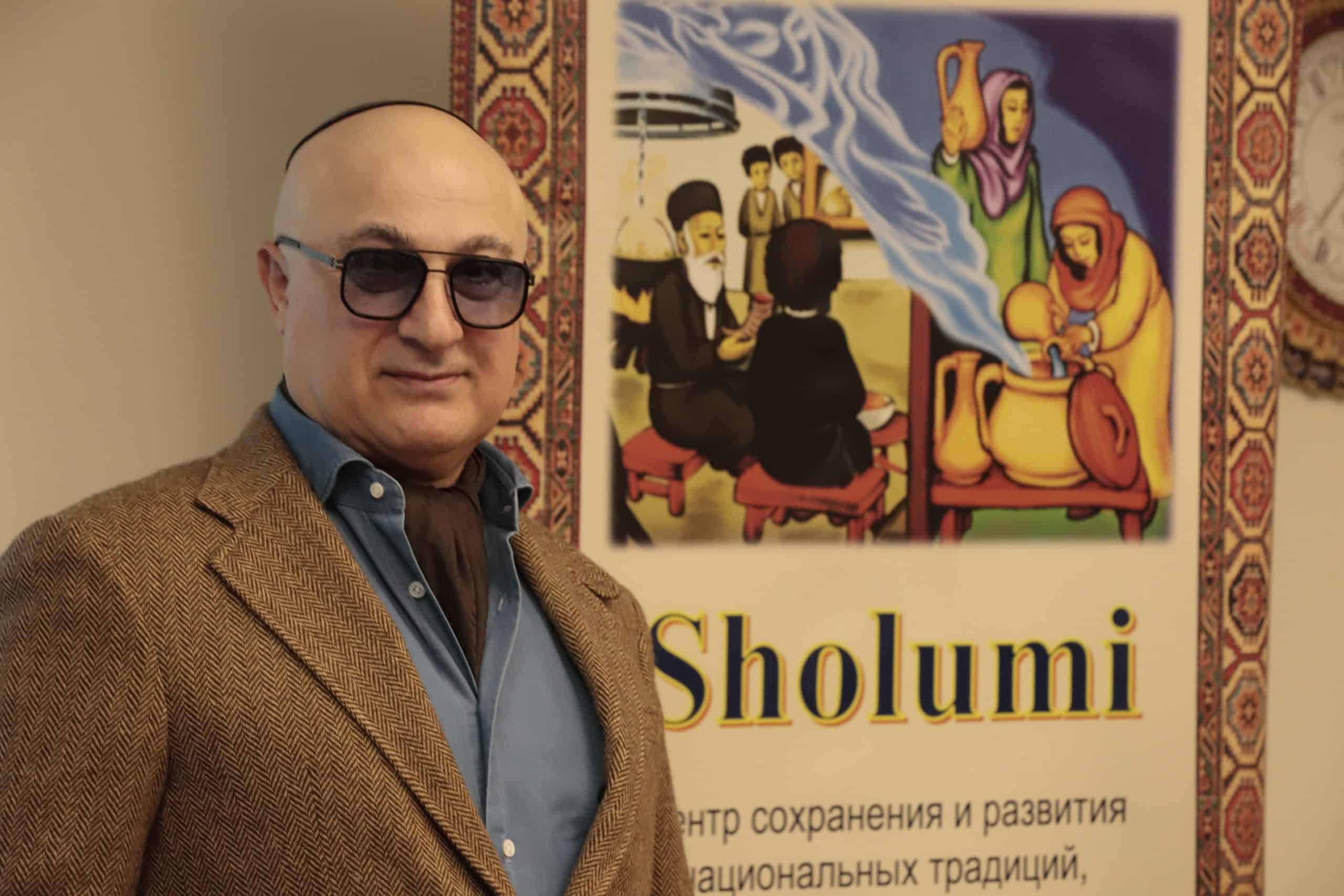 אמן השטיחים אלברט רפייב לצד שלט מרכז "Sholumi" (מרכז למורשת יהודי יהדות ההר)