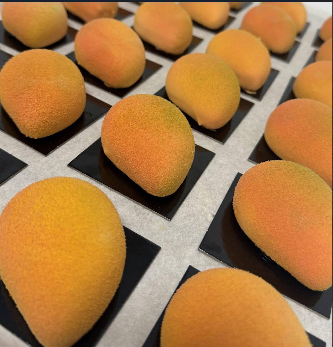מנגו – קרם שקדים, קרמו טרופי וקולי טרופי בציפוי מוס טרופי וקראנץ’ שוקולד לבן.