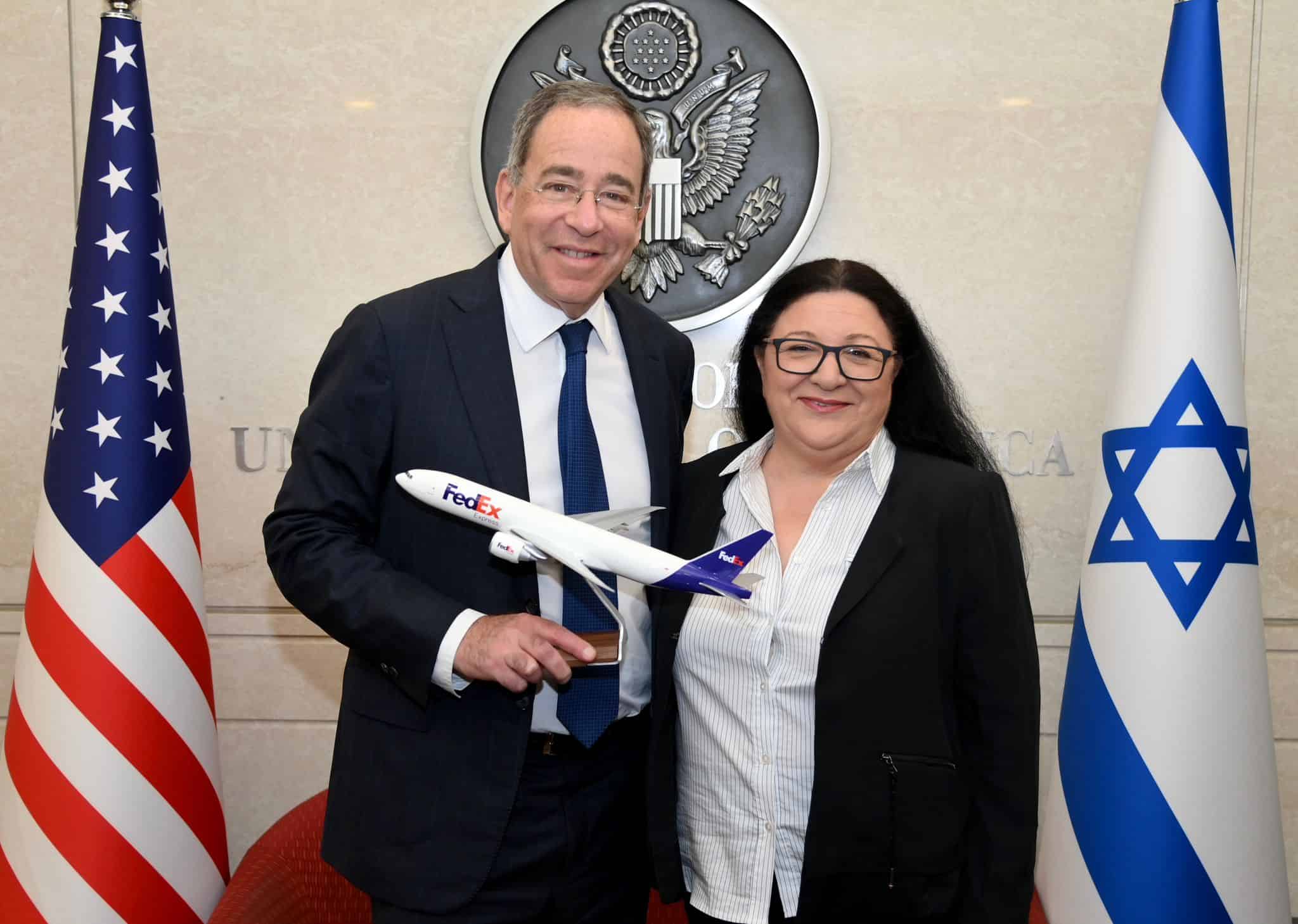מר תומאס ניידס, שגריר ארה"ב בישראל והגברת מרים צור, מנכ"לית FedEx אקספרס ישראל נפגשו לציון 50 שנים לפעילות FedEx העולמית במפגש המיוחד, הציגה מנכ"לית פדקס לשגריר ארה"ב את פעילות פדקס אקספרס ישראל בשנים האחרונות, בדגש על פעילות יצוא והיבוא של ארה"ב וישראל הכוללת 20 טיסות שבועיות עם שירות Next Day לכל מיקוד ברחבי ארה"ב, הפעילות המורכבת בתקופת הקורונה והשפעת צמיחת האי-קומרס (E-Commerce).
