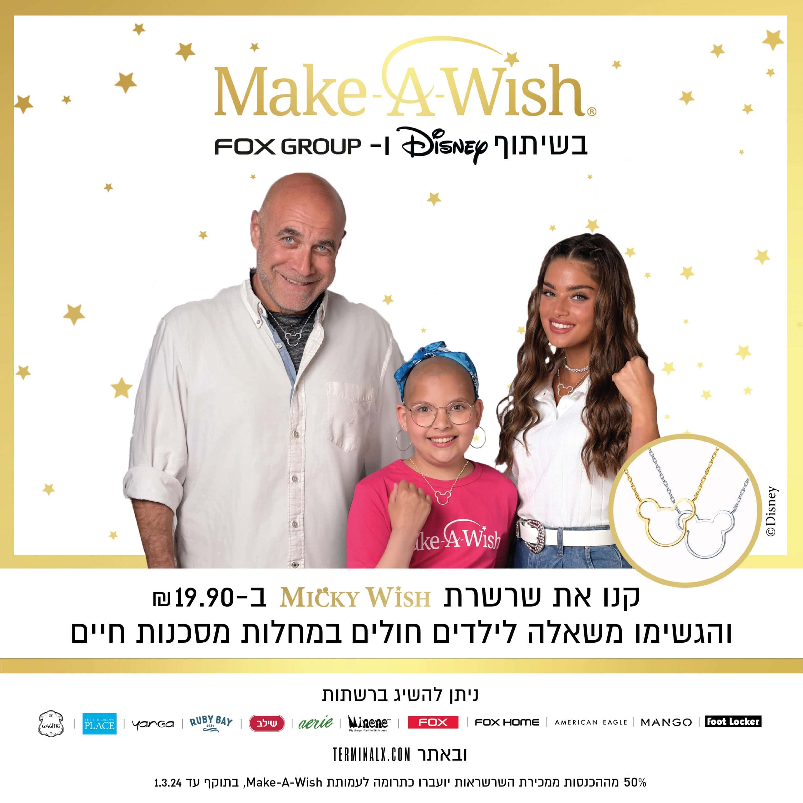 זוהי השנה השלישית ברציפות שקבוצת FOX בשיתוף דיסני חוברות לעמותת Make-A-Wish Israel. במסגרת שיתוף פעולה זה תימכר שרשרת "Mickey Wish" ב-19.90 ₪. השרשרת תימכר במהלך חודש פברואר בשני צבעים: זהב וכסף במותגי קבוצת פוקס ביניהם: פוקס, פוקס הום, אמריקן איגל, מנגו, ועוד וכן באתר הסחר של הקבוצה טרמינל X: הרווחים מקמפיין זה יועברו לטובת הגשמת משאלות לילדים החולים במחלות מסכנות חיים.