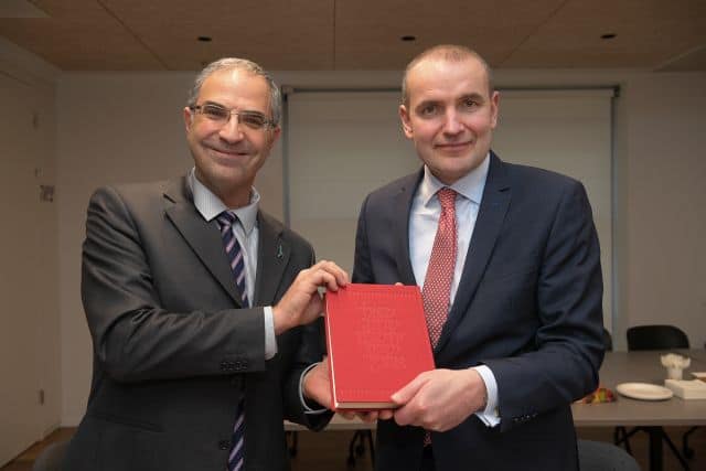 נשיא קפריסין ניקוס אנסטסיאדיס וראש עיריית פאפוס פדונאס פדונוס, הגיעו השבוע לביקור חגיגי בעיר הרצליה, במהלכו קיבל הנשיא תואר דוקטור לשם כבוד, מהמרכז הבינתחומי הרצליה. בסיום הטקס קיים ראש העיר משה פדלון קבלת פנים רשמית למשלחת מקפריסין. הביקור התקיים כחלק מביקורו של נשיא קפריסין בישראל במסגרת פורום השואה העולמי, לציון אירועי 75 שנה לשחרור מחנה ההשמדה אושוויץ. בין העיר הרצליה והעיר הקפריסאית פאפוס ישנה ברית ערים תאומות. כחלק מברית זו, בחודש אפריל הקרוב תיפתח בפאפוס אוניברסיטה, בשיתוף עם המרכז הבינתחומי, ובתיווכו של ראש העיר משה פדלון. משמאל לימין: נשיא קפריסין ניקוס אנסטסיאדיס, ראש עיריית הרצליה משה פדלון, ועפרה בל סגנית ראש העיר.