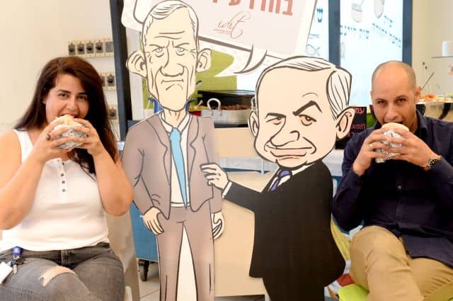 חב' ההסעדה "עידית" המספקת שירותי הסעדה, ערכה השבוע במתחם האוכל של חב' "פלאפון" בגבעתיים, חגיגת אוכל ישראלי לעונת הבחירות, עם דמויות מאויירות של ביבי וגנץ והרבה אוכל ישראל כמו: פלאפל, שווארמה, המבורגרים, סלטים שונים ועוד. כ- 500 עובדים "פלאפון" נהנו מאוכל ישראלי עם ריח של בחירות. בצילום: פז דותן מנהלת חב' פלאפון ואסף אמרוסי מנהל שיווק בחב' "עידית", אוכלים מנת פלאפל .