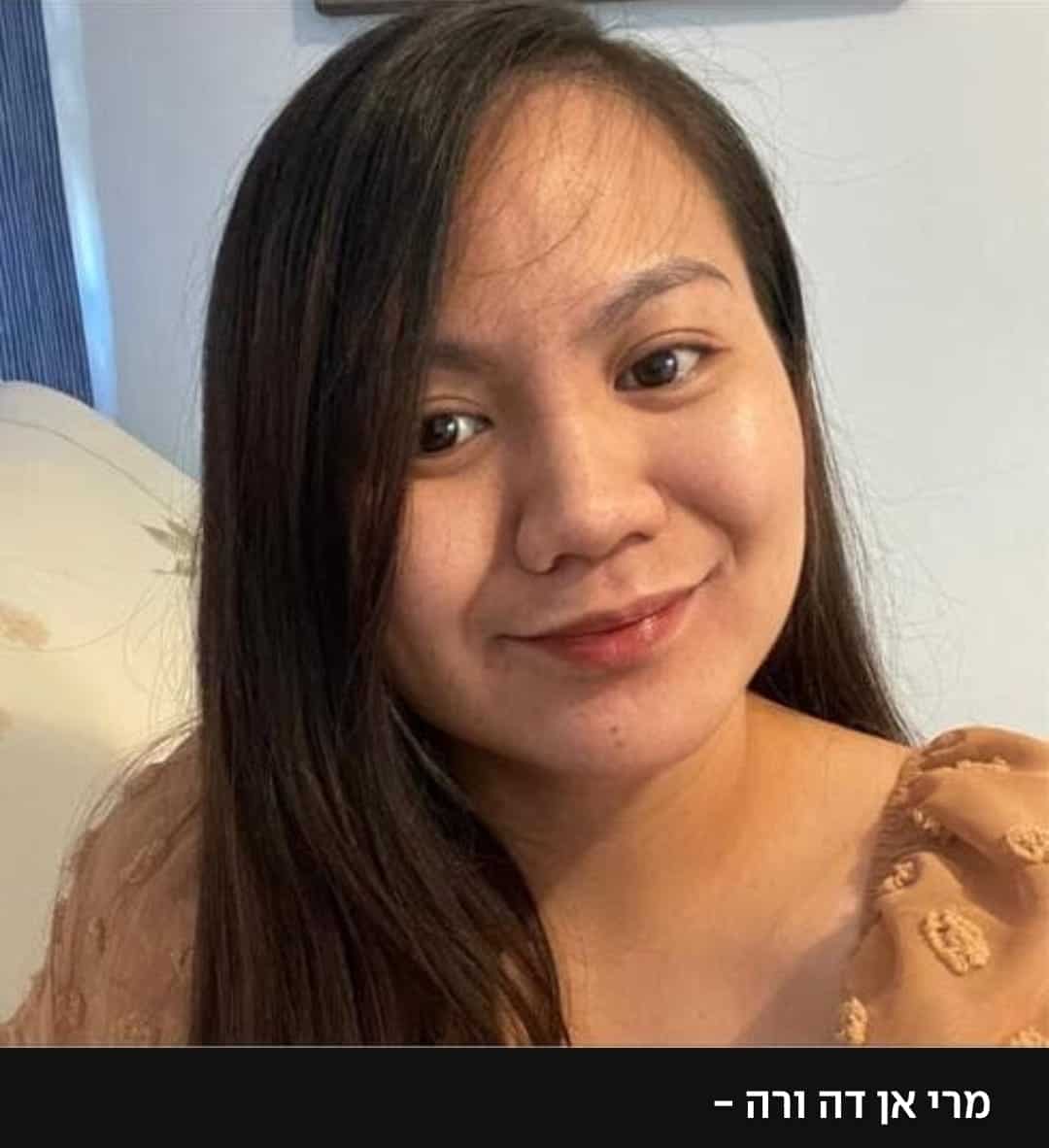 מרי אן דה ורה, אזרחית הפיליפינים בת 32, היא ההרוגה מפגיעת הטיל הישירה בבניין המגורים בתל אביב אמש (שבת). דה ורה, שעבדה בישראל בשלוש השנים האחרונות כמטפלת סיעודית, אותרה תחת ההריסות לאחר מאמצי חילוץ מורכבים. מותה נקבע במהלך הפינוי לבית החולים.