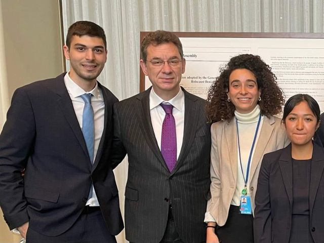 עצרת האו"ם אימצה את ההחלטה ביוזמת ישראל, כנגד הכחשת השואה ועיוותה. לאו"ם הוזמנו ניצולי שואה ומנכ"ל פייזר אלברט בורלא (בתמונה שני מימין). גם דור קטורזה, הבן של ישראל קטורזה, המתגורר בניו יורק והינו מנהל המדיה של שגריר ישראל באו"ם גלעד ארדן, נוכח באירוע (בתמונה ראשון משמאל).