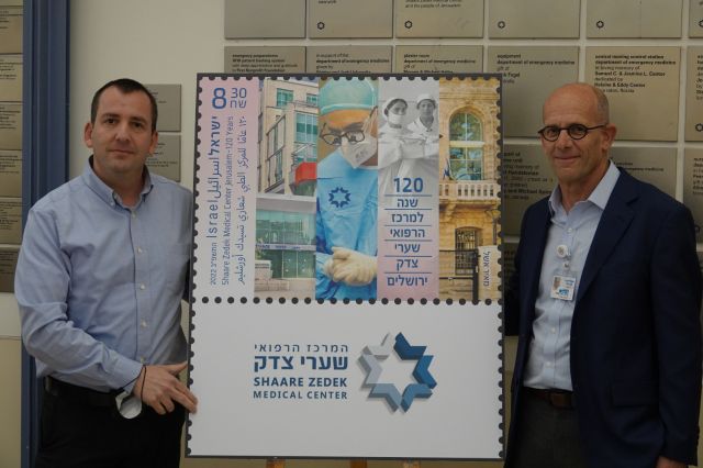 השירות הבולאי השיק השבוע בול לציון 120 שנה להיווסדו של בית החולים שערי צדק והוקרה על פועלו, ומסירותו של צוות המרכז הרפואי העושה לילות כימים למען בריאות הציבור בימים המאתגרים של מגפת הקורונה. בטקס השתתפו פרופ' עופר מרין (מימין) ומנהל השירות הבולאי אלחנן שפירא.