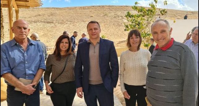 שר התיירות יואל רזבוזוב (יש עתיד), מנכ"ל משרד התיירות הנכנס דני שחר וצוות המשרד הגיעו לביקור בחבל אילות. ראש המועצה האזורית חבל אילות ד"ר חנן גינת ומנכ"לית החברה הכלכלית איריס דניאלי הציגו לשר ולמנכ״ל את חזון המועצה לפיתוח התיירות כמנוע צמיחה משמעותי בחבל אילות, המהווה כ-13% משטח מדינת ישראל. מימין לשמאל: ראש המועצה האזורית חבל אילות ד"ר חנן גינת, מנכ"לית החברה הכלכלית איריס דניאלי, שר התיירות יואל רזבוזוב, מנהלת התיירות ליטל שמואלי ומנכל משרד התיירות דני שחר.