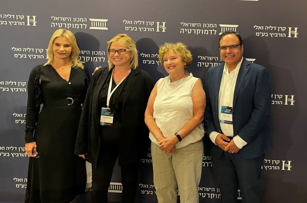 כנס "אלי הורביץ לכלכלה וחברה 2022" התקיים במלון אוריינט ירושלים ביוזמת המכון הישראלי לדמוקרטיה. השתתפו: יצחק הרצוג נשיא המדינה  ראש הממשלה נפתלי בנט, ראש הממשלה החלופי יאיר לפיד, שר הביטחון בני גנץ, שר האוצר אביגדור ליברמן, שרת הכלכלה אורנה ברביבאי. בעלי תפקידים בכירים במשק ועוד. בתמונה: פרופ' קרנית פלוג מהמכון הישראלי לדמוקרטיה, עינת זינגר-דן, מנכ"לית BR ISRAEL והפורום הכלכלי חברתי, דפנה אבירם-ניצן מנהלת המרכז לממשל וכלכלה ומנהלת כנס אלי הורביץ לכלכלה וחברה וצורי דבוש יו"ר חברת קליל.