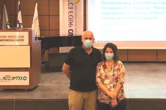 בבית חולים מאיר בכפר סבא כ-50 רופאים התפנו מעיסוקי הקורונה וטיפול בחולים והגיעו לשמוע סקירה מיוחדת של יוסי בן, מנכ"ל חברת אמורפיקל ושל פרופסור אמיר ערב, על התפתחות החברה ומוצר הסידן קרבונט אמורפי החדשני שגילתה- דנסיטי קידס. זה היה למעשה המפגש הראשון שאושר לרופאים לקיים במסגרת פנים מול פנים, שנאספו באולם המליאה הגדול בבית החולים, בהתאם לתקנות התו הסגול, והיתר הצטרפו אל ההרצאה באופן מקוון, עקב ההגבלות. יוסי בן התרגש לפגוש במסגרת ההרצאה את ד"ר עופרי היוש, המסיימת בימים אלו התמחות ברפואת ילדים שהכירה את המוצר אשר פיתח בן באופן אישי, לאחר שסייע רבות לבריאותו של קרוב משפחתה. בתמונה: יוסי בן וד"ר עופרי היוש.