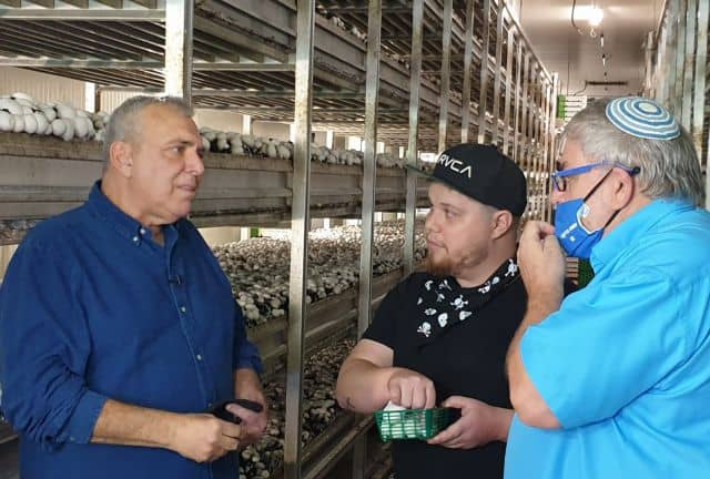 מנחם הורוביץ ושף שחר לוי ממאסטר שף בביקור בחוות הגידול "מרינה פטריות הגליל". השבוע הצפין צוות הצילום של התכנית "שווה בדיקה"  ובראשם מנחם הורוביץ, מלווה בשף שחר לוי (מאסטר שף). השניים שהגיעו להכיר מקרוב ולטעום את סוגי הפטריות הגדלים בחוות הגידול במושב חוסן בגליל המערבי, זכו לסיור מרתק מפיו של מייסד החברה רמו בן שושן וטעמו את המוצרים החדשים של החברה: שווארמה פטריות והמבורגר טבעוני, שכולו פטריות טריות. במהלך הביקור נפגשו עם שף החברה בן עייש, שהכין להם מעדני פטריות. בתמונה מימין: מנחם הורוביץ, השף שחר לוי עם רמו בן שושן בחדר גידול הפטריות.