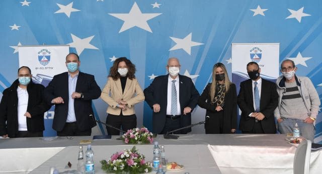 בשיא הסגר השלישי ביקר נשיא המדינה ראובן (רובי) ריבלין בעיר בת-ים, בה הסתיים פיילוט "העסק של כולנו", יוזמת פייסבוק ישראל והפורום הכלכלי-חברתי, המסייע לעסקים קטנים מכל הארץ בתקופת הקורונה. נשיא המדינה נפגש עם בתי עסק שונים שקיבלו סיוע מהמיזם, שמע מהם על התקופה וכיצד הצליחו להתאושש בזכות הסיוע שקיבלו מהתכנית. את הצגת המיזם בפני הנשיא הובילו מנכ"לית פייסבוק ישראל עדי סופר תאני, וסמנכ"לית הפורום כלכלי-חברתי יפעת זמיר. התוכנית הכשירה 170 סטודנטים לתהליך הליווי המוצע לעסקים, ורשמה 130 עסקים קטנים שהחלו בתהליך ברשויות שונות, כאשר היעד ל-2021 הוא להכניס לתכנית למעלה מ-1000 עסקים נוספים בהשתתפות מרכז השלטון המקומי. בתמונה מימין: בעלי ״חניתה״ חנות צילום ומתנות קובי שחוח, מנכ"ל בית הנשיא הראל טובי, מנכ״לית פייסבוק ישראל עדי סופר תאני, נשיא המדינה ראובן (רובי) ריבלין, סמנכ״לית הפורום יפעת זמיר, ראש העיר בת ים צביקה ברוט ובעלי ״מאמא דיאלי״ אוכל מוכן עופר זריהן.