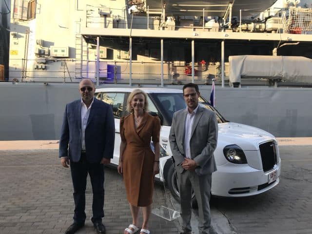 לאחר 73 שנה לעזיבת המשחתת הבריטית האחרונה את נמל חיפה, עגנה לאחרונה בנמל המשחתת הבריטית Richmond HMS כחלק מסעותיה במזרח הים התיכון. ביוזמת הנספח הכלכלי של שגרירות אנגליה בישראל מר Lord Austin הוצג הרכב הבריטי החדש שיגיע בימים אלו לישראל LEVC TX – המונית הלונדונית. הרכב הוצג לצד המשחתת כחלק מקמפיין יחסי ציבור והשיווק של היצרן האנגלי LEVC. באירוע הצגת המונית הלונדונית על סיפון המשחתת השתתפו הנספח הכלכלי שגרירות אנגליה בישראל Lord Austin, מזכירת ההגנה Meet Rt Hon Elizabeth Truss, אוהד זליגמן יו"ר חב' "E.V. MOTORS" אדוארד דורון שותף בחברה ועופר סגל סמנכ"ל השיווק והמכירות. בתמונה מימן לשמאל: אוהד זליגמן יו"ר קבוצת חב' E.V. MOTORS, מזכירת המדינה הגברת אליזבת טרוס, מר אדוארד דורון שותף בקבוצת E.V. MOTORS MOTORS.