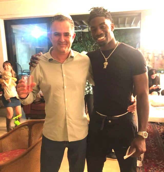 סטפן לזר חגג את הנר האחרון של חנוכה בבית משפחת הקבלנים המורחבת והידועה יצחקי בביתם בסביון. סטפן הינו בן בית עוד מילדותו בבית המשפחה הזו, וחגים רבים הם חוגגים ביחד. בתמונה עם ד"ר גדי חסון רופא השיניים הנודע, הנשוי לבת משפחת הקבלנים יצחקי.