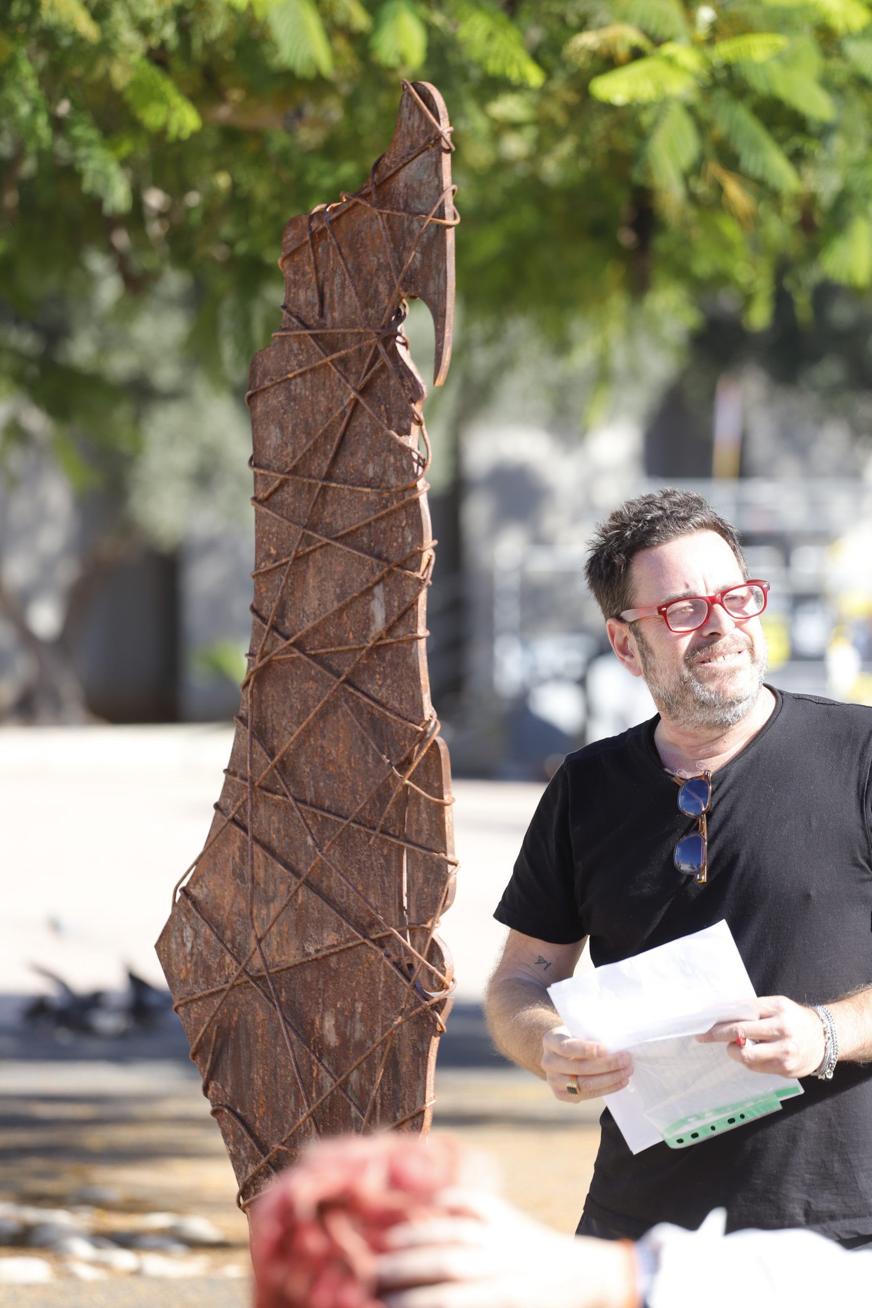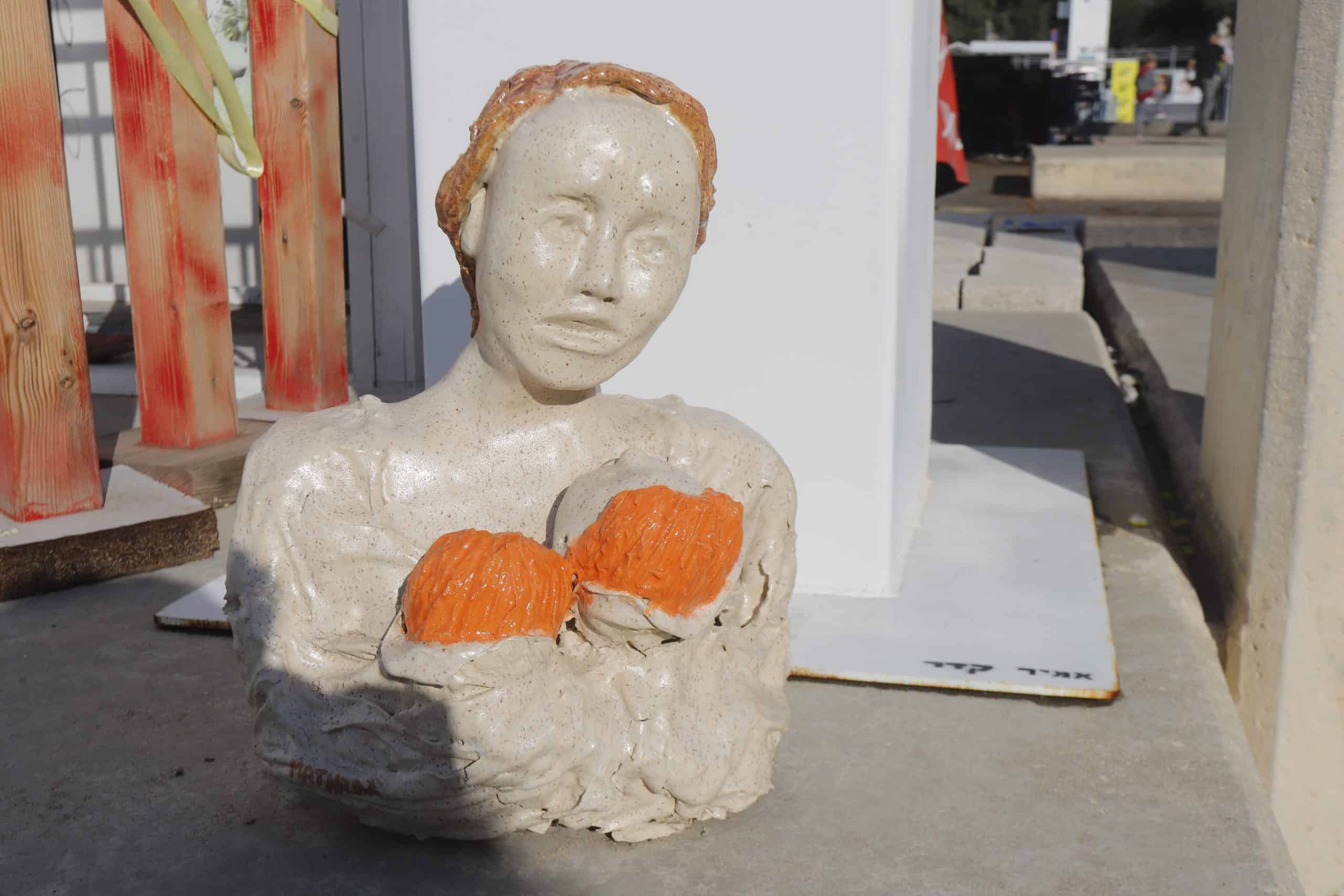 בין האמנים שהתגייסו למען המטרה, נמצא שלומי בן יקר, שבחר לבטא את זעקתו באמצעות פסל עוצמתי. "מאז השביעי באוקטובר, אני מוציא עוד ועוד יצירות בהקשר הזה, וזו הזעקה שלי," הוא משתף. פסלו "מעבר לגדר" מתנשא לגובה שני מטרים ושוקל 300 ק"ג, עשוי ברזל גולמי וכבול בכבל מתכת. "אני חושב שיש בו המון כאב, המון זעם, המון כעס, אבל גם המון תקווה," מוסיף בן יקר. הפסל, לדבריו, "נוגע בכל האירוע המסחרר והנורא הזה", ומהווה עבורו "זעקה" אישית וציבורית.