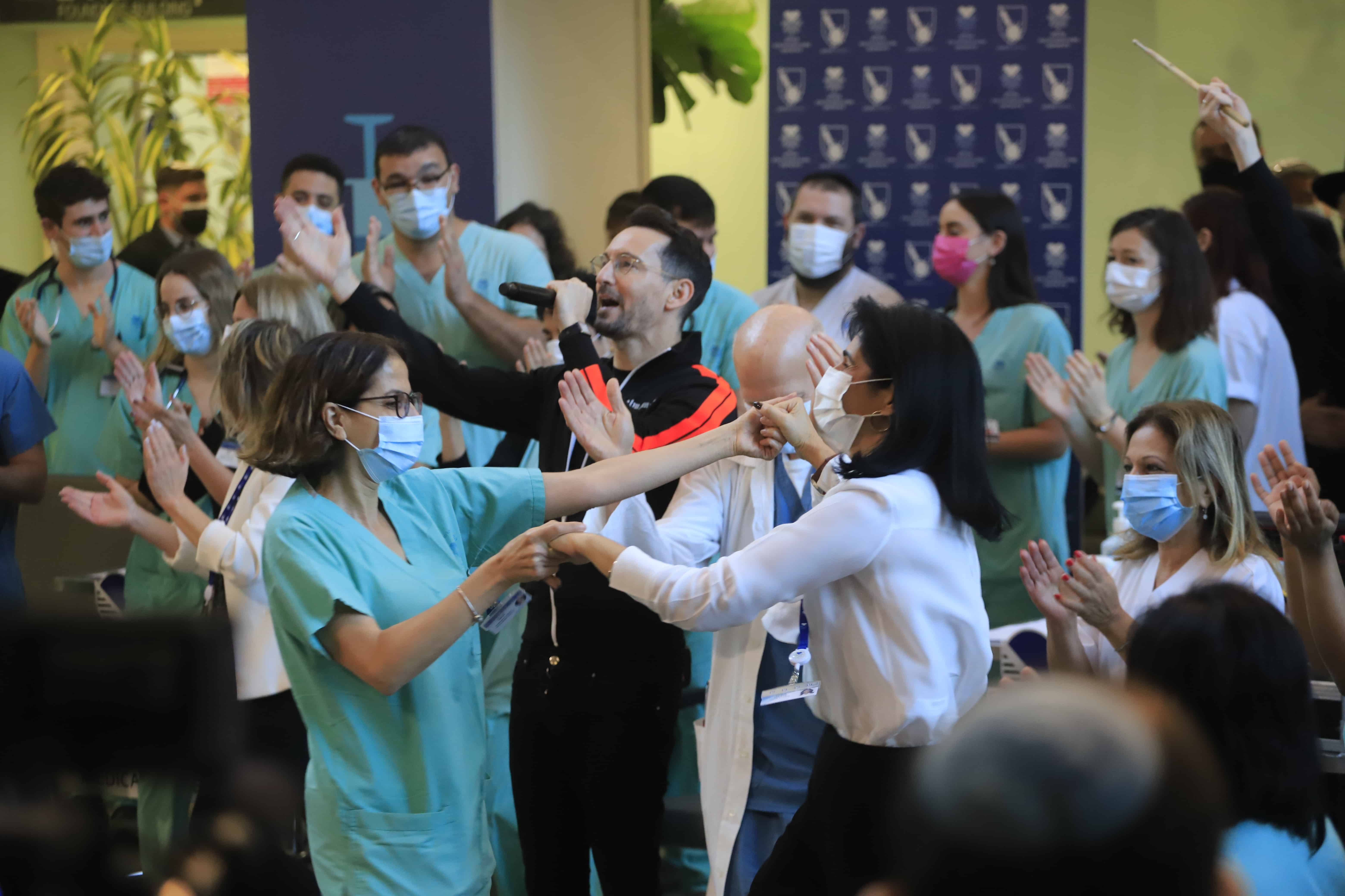 מיד אחריהם עלו צמרת הרופאים והאחיות המנהלות של בית החולים איכילוב למפגן עוצמה מרגש של הבעת תמיכה בחיסון לנגיף הקורונה.