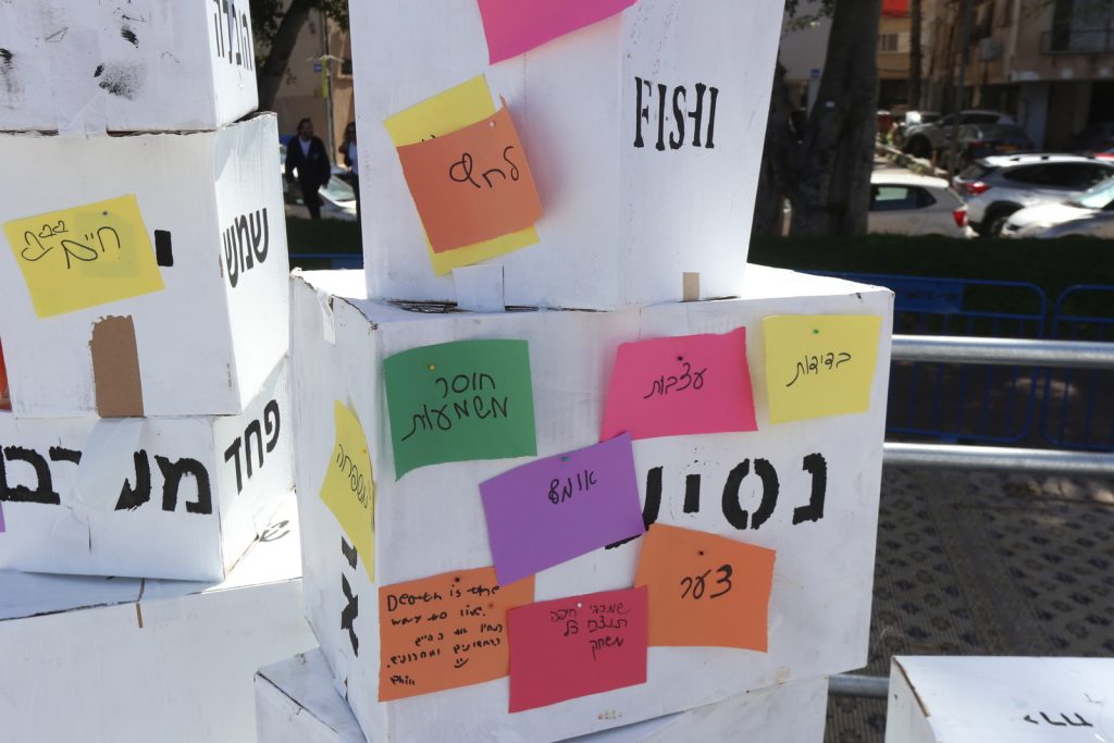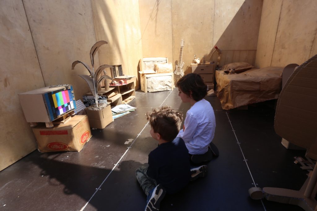 חדר בריחה מקרטון מבחוץ תלו ציורי עיניים גדולים "זה מתאר את הלחצים והציפיות שיש מאתנו בני הנוער" סיפר לי