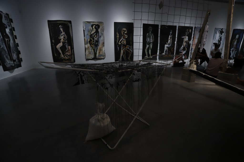 מריה סאלח מחאמיד – בת לאם נוצרייה מאוקראינה ולאב ערבי-מוסלמי – עוסקת בזהוּת ופליטוּת, אמהוּת וגזענות ומתמידה לצייר בפחם, המזהה את עיר הולדתה אום אל-פחם, "אֵם הפחם". בתערוכה היא פורשׂת את סיפורה האישי כאשה, כאֵם וכאמנית ואת הסיפור הקולקטיבי של החיים בארץ על רקע המאבק הישראלי-פלסטיני, האלימות והפשע בחברה הערבית והיהודית והמלחמה באוקראינה, בנוכחות אֶפּית של מגילות המתווספות זו לזו. בעבודה האם זה בטבענו? מתעבה האפוס ברובד נוסף. יצירתו של ציבי גבע – שנולד וגדל בקיבוץ עין-שמר – מתייחסת להיבטים תרבותיים של נוף המקום המסוכסך ומעניקה להם ביטויים פיסוליים, מושגיים וחומריים. בסדרת עבודות מהשנה האחרונה המוצגת בחלקה בתערוכה, נראות דמויות אנושיות-היברידיות, המתפרקות ומשתנות בלי הפסקה ומתעמתות עם עצם קיומן החומרי על מצע של גומי שחור. נעה יקותיאלי – בת לאם יפנית ולאב ישראלי-אמריקאי, הפועלת בניו-יורק יוצרת דגמים החוקרים את התבניות החברתיות-פוליטיות של מלחמות, קונפליקטים ומנגנוני הכחשה. בתערוכה היא מעמידה מיצב תלוי-מקום, שבמרכזו רצפת בטון סדוקה, בקירו המרכזי חיתוך נייר של חלון ענק שמראות הרס נשקפים דרכו, ושטיח-הרס ממגזרת נייר התלוי על מתקן כביסה נייד.