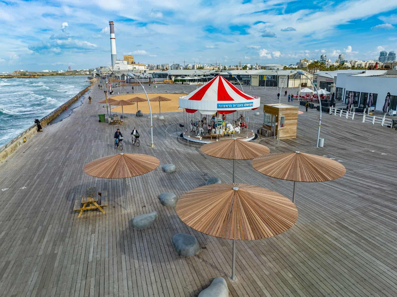 מוכנים לימי הקיץ: לצד שידרוג מתקני המשחקים, גאה הנמל בפרויקט נוסף שהסתיים בימים אלה. עשרות שמשיות הצללה חדשות הותקנו מעל ספסלי האבן והפיקניק הפזורים לאורך טיילת והדק. השמשיות עמידות בפני פגעי מזג האוויר ומעוצבות כקונוסים של לוחות עץ בגוונים טבעיים המתמזגים עם המראה "החמים" של רצפת לוחות הדק.