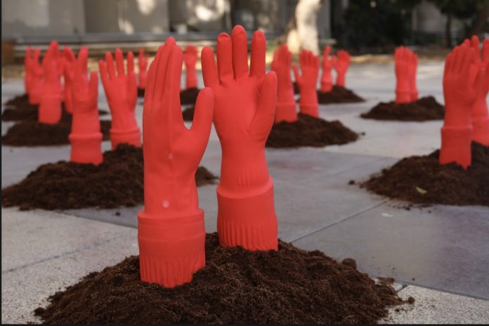 במיצג הוצבו כ-30 ערימות אדמה המזכירות קברים, ומהן הזדקרו עשרות זוגות ידיים אדומות, תזכורת לקבורתה של ליטל מלניק ז"ל בעודה בחיים, אולם גם סמל לדרכים הרבות בהן החברה קוברת מדי יום נשים בעודן בחיים: אלימות מינית, עוני, רעב, הקטנה, הדרה, פגיעות בגוף ובנפש ועוד. לצד הקברים עמדו פעילות שידיהן בכפפות איגרוף אדומות.