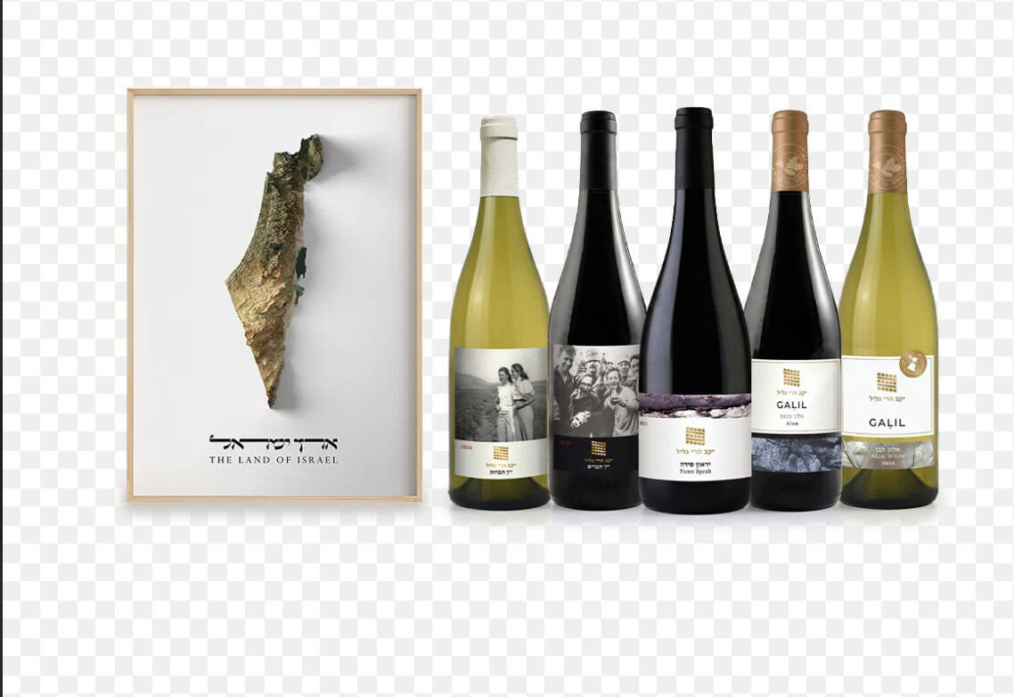 מארז "אביבי ישראלי" (349 ₪) – כולל יינות מסדרת גליל (שרדונה, רוזה, לבן, קברנה סוביניון וסירה), לצד פוסטר נוף ישראלי.