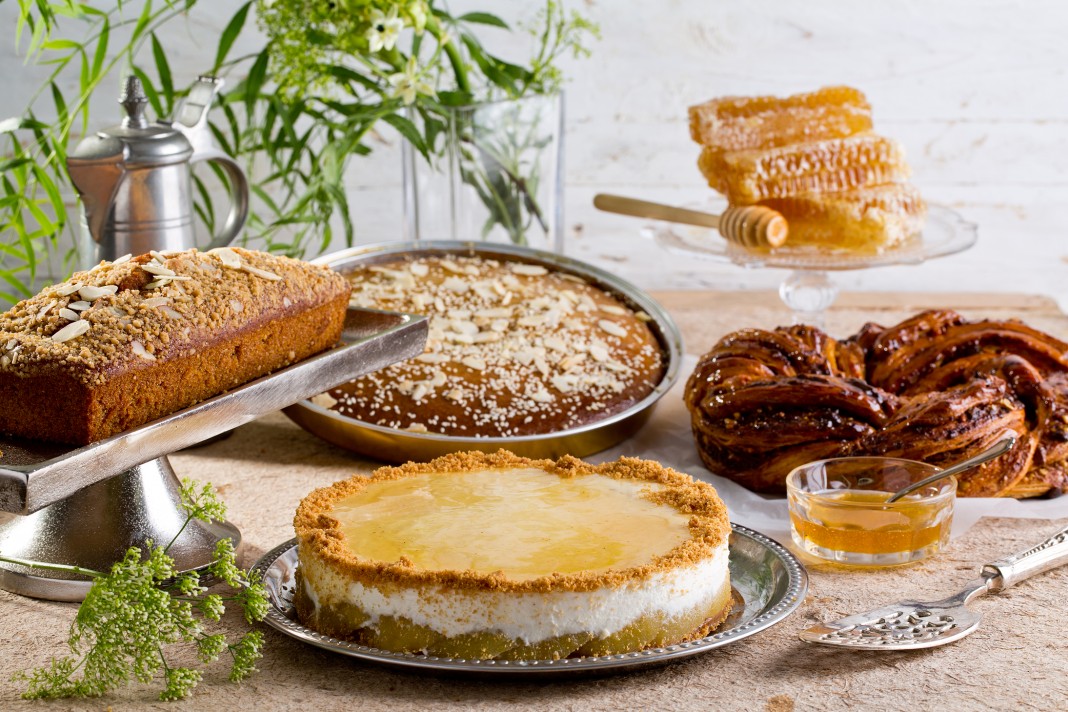 כוורת (פרווה) – שכבות רכות אפויות של פקאן ודבש. מוס שוקולד לבן, פקאן מקורמל, מרמלדת תפוחי עץ וזיגוג דבש. 164 ₪ (12 מנות) וכמובן עוגת דבש בחושה- עשירה בדבש טהור, אגוזי מלך ותבלינים 39 ₪