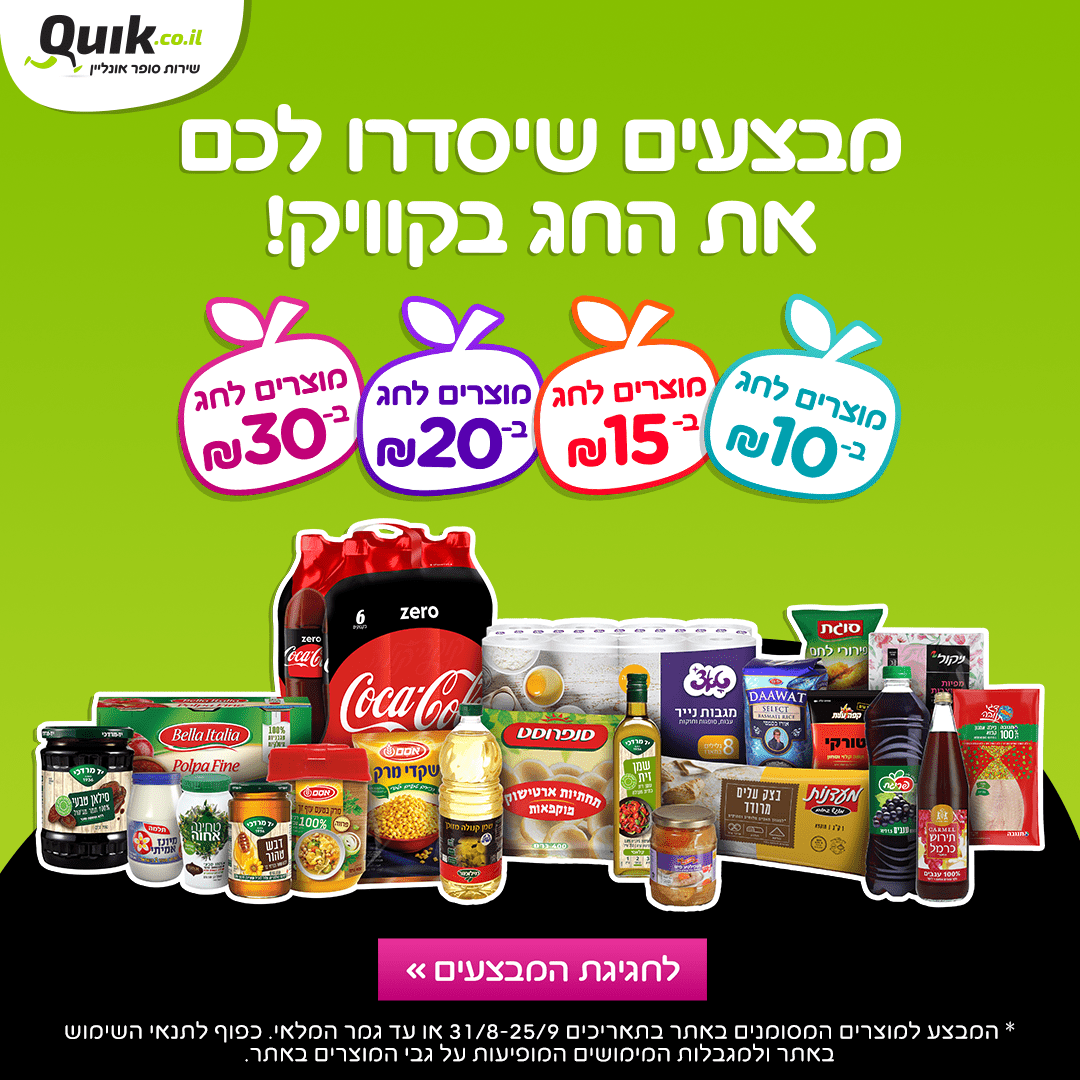 באתר קוויק שירות סופר אונליין ניתן למצוא כבר מעכשיו מגוון רחב של מבצעים מיוחדים ומשתלמים במיוחד לראש השנה, תחת הקונספט של מוצרי חג ב-10, 15, 20 ו-30 שקלים. את המוצרים ניתן לקבל במשלוח מהיום להיום עד הבית, גם בימי שישי, בעלות המשלוח הנמוכה ביותר בשוק (מבין המתחרים) או בחינם בהזמנה מעל 499 ₪, וגם באיסוף עצמי מבלי לצאת מהרכב, חינם בקנייה מעל 150 ₪. המבצעים בתוקף עד ה-25.9.22 או עד גמר המלאי.