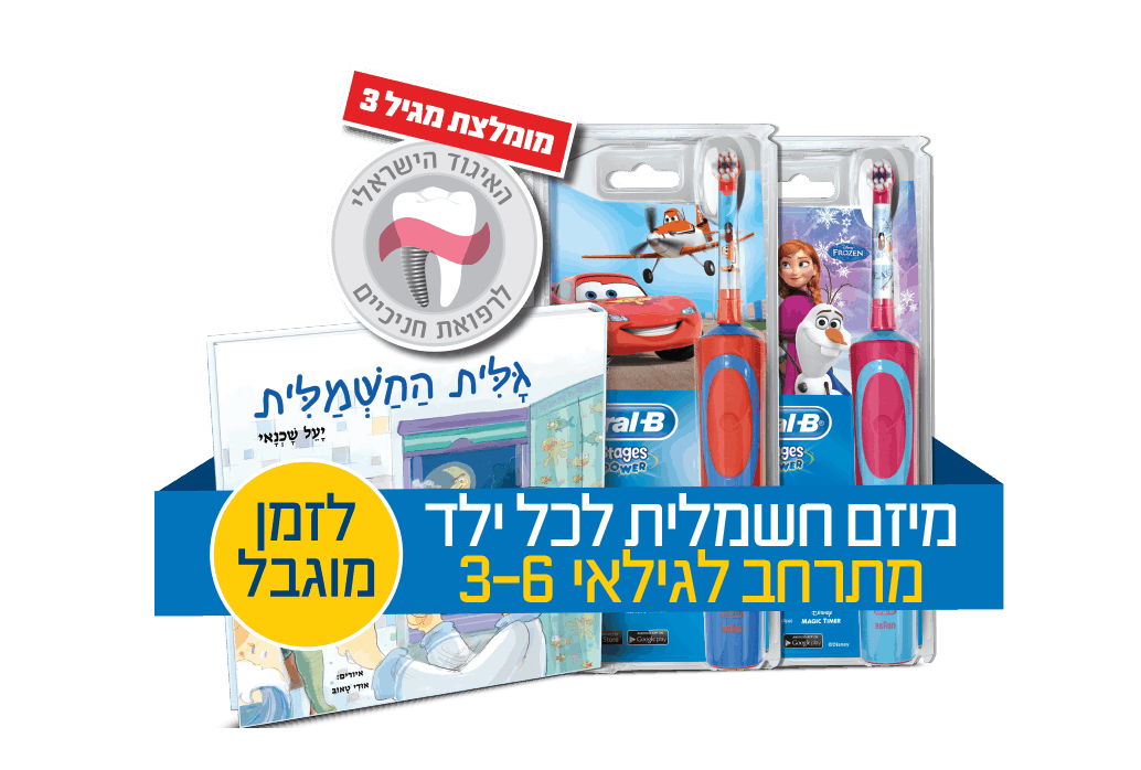 לחודש בלבד, המיזם המצליח 'מברשת שיניים חשמלית לכל ילד' מתרחב לגילאי 3-6 וכולל ערכה של מברשת חשמלית לילד עם ספר חוויתי המלמד על הרגלי צחצוח נכונים במחיר מסובסד של 39.90 ₪ במקום 189.90 ₪.
